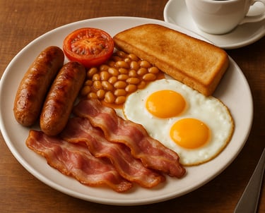 2 Sausages, 2 Eggs, Bacon, Beans or Tomatoes and Toast incl. Coffee or Tea