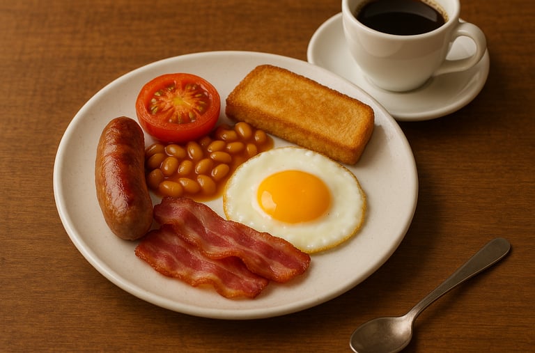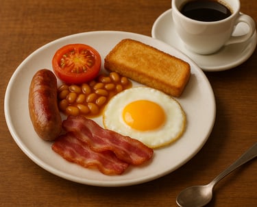1 Sausage, 1 Egg, Bacon, Beans or Tomatoes and Toast incl. Coffee or Tea